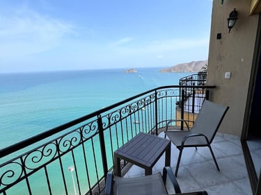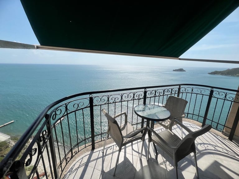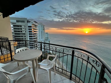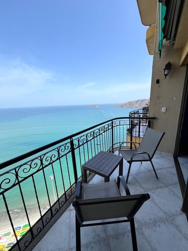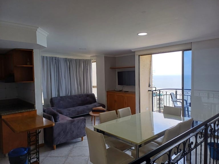3 alcobas, 2 baños, sala, comedor, cocina y balcón con vista al mar.