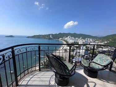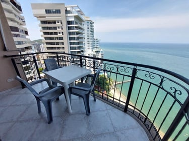 3 alcobas, 4 baños, sala, comedor, cocina y balcón con vista al mar.