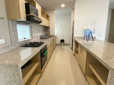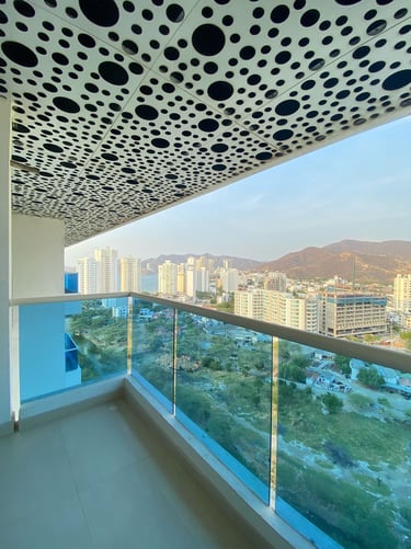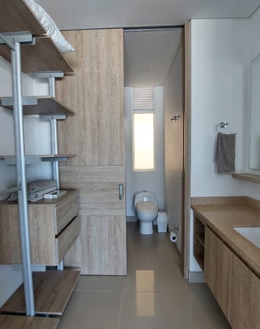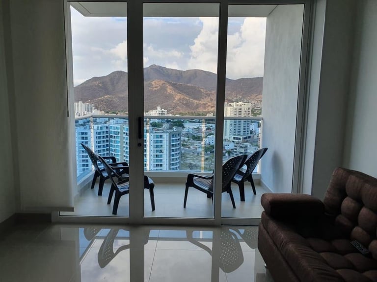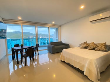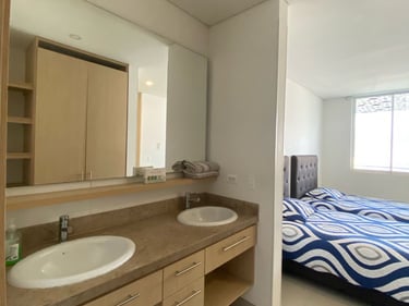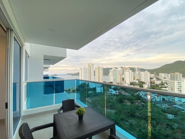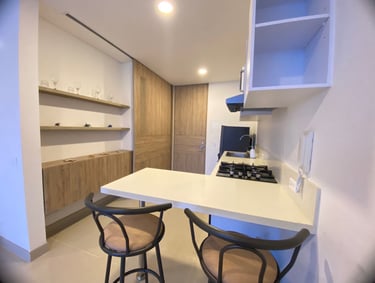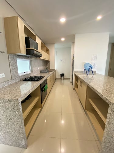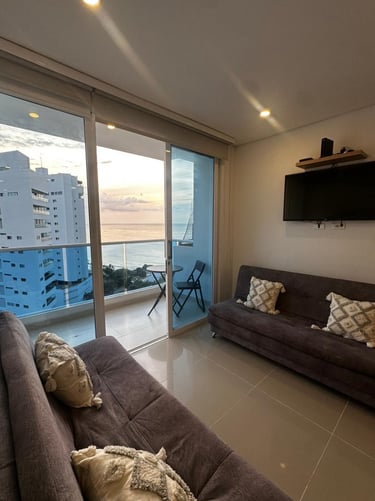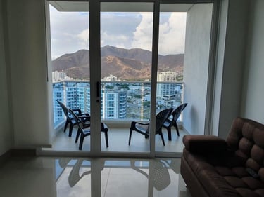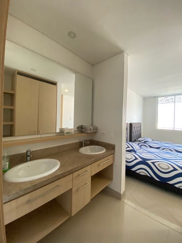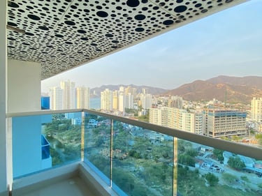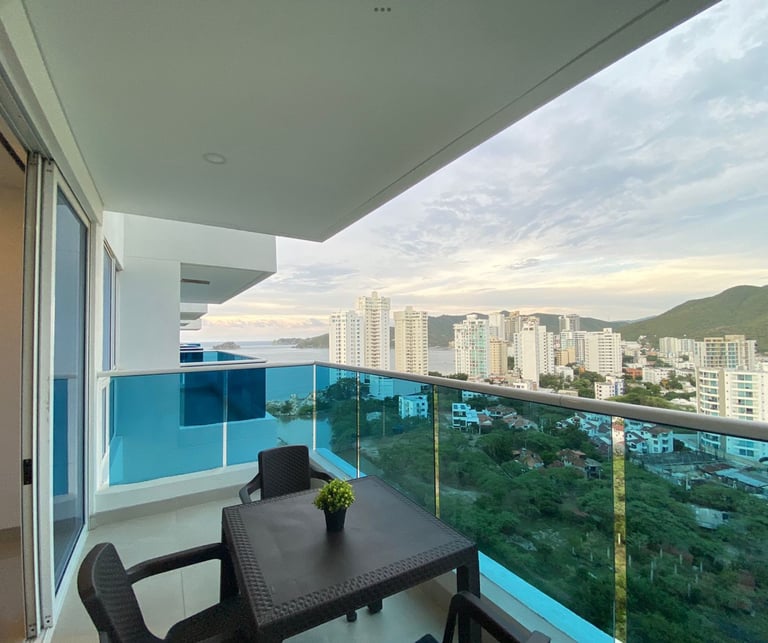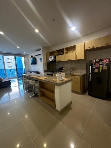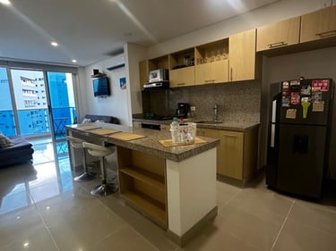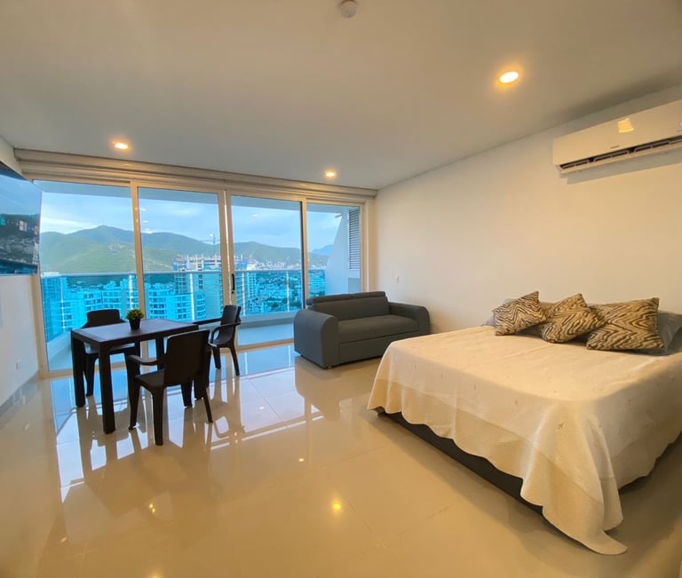 2 alcobas, 2 baños, sala, sofá cama, cocina y balcón con vista a la ciudad.