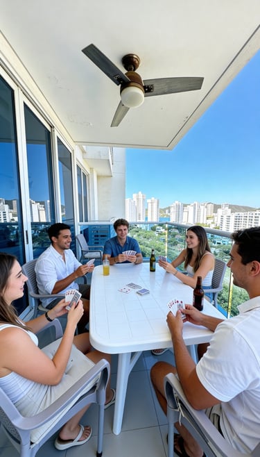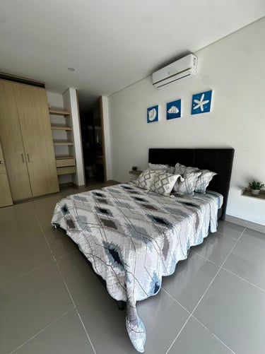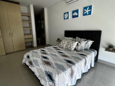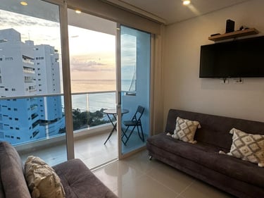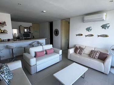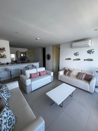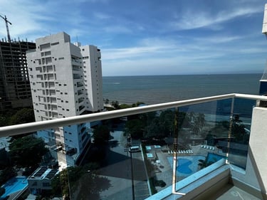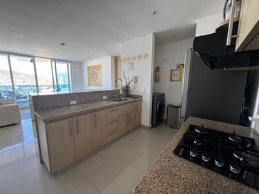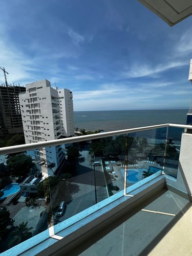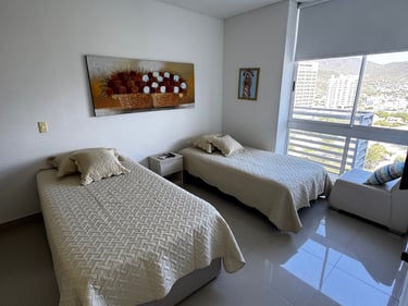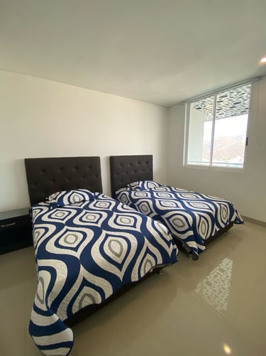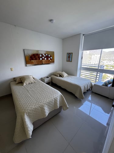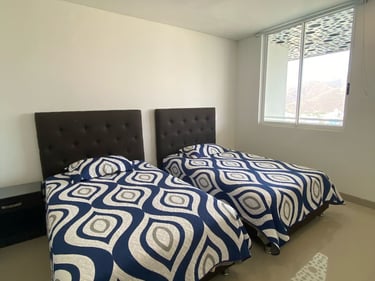 2 habitaciones, cama sencilla nido, sala, sofa camas, 2 baños, cocina y balcon con vista al mar.
